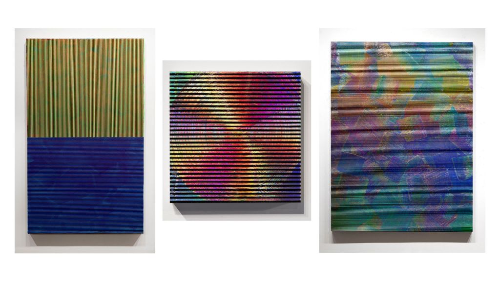 What came next was the holographic vinyl. Once I gained clarity on that personal conflict, collage material could serve a purpose more fitting to the abstraction and aesthetic overload that my nonobjective paintings were fostering. It’s still a strange component in itself, because it’s alive. You move, and it moves too. It uses the spectrum to tell you that you’re there, present and in the moment.