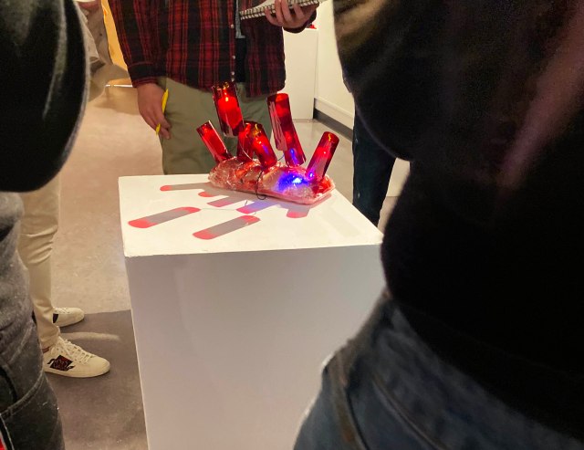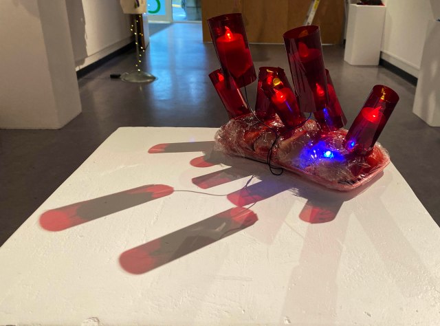 Alive | Chicken breast, blood, fake blood, LED lights, cellophane sheet | 2020